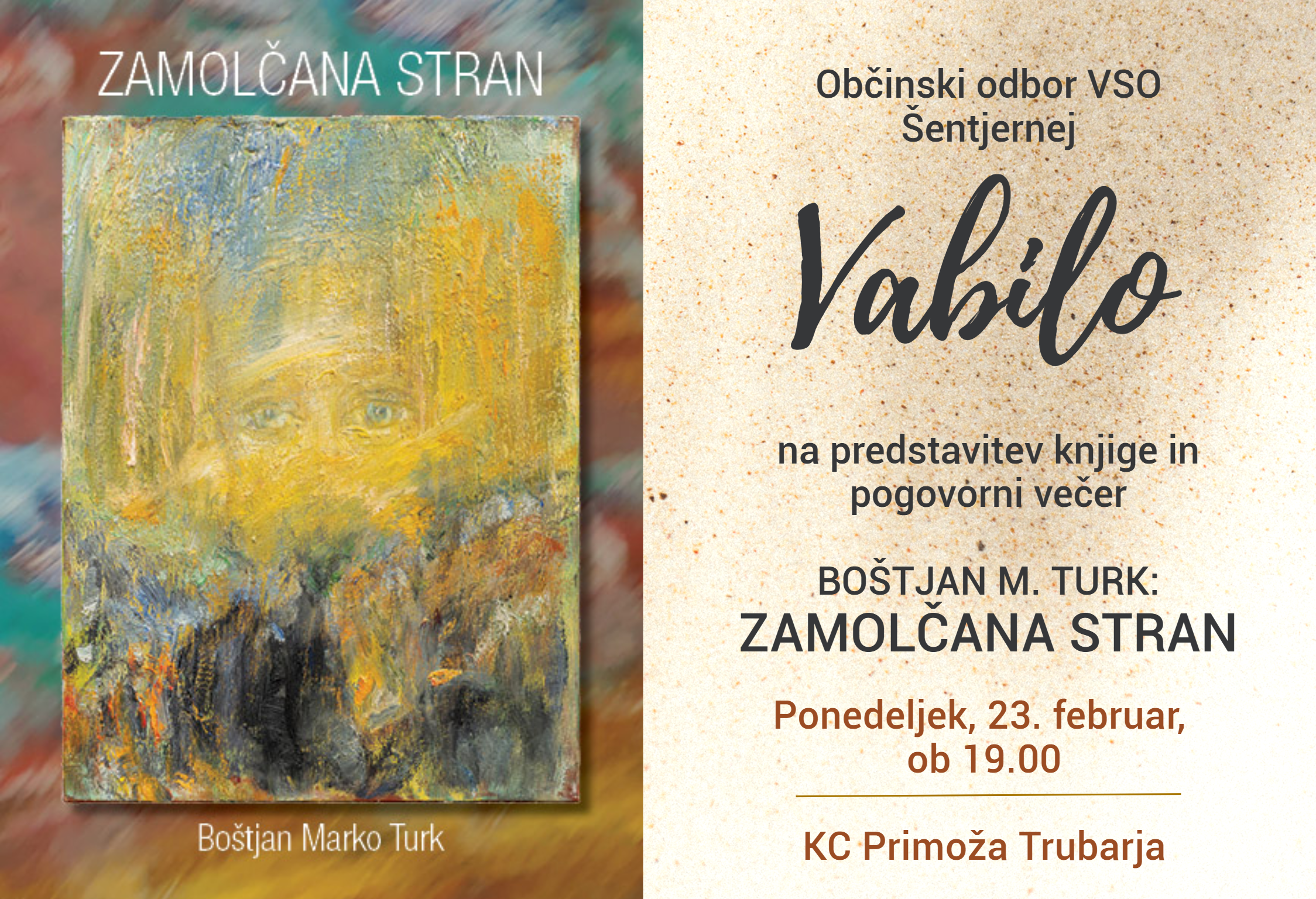 Občinski odbor VSO Šentjernej vabi na predstavitev knjige in pogovorni večer z avtorjem Boštjanom M. Turkom.